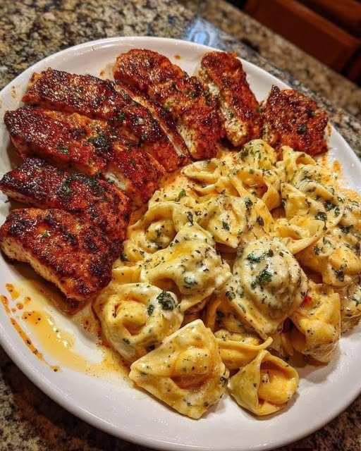 Plate creamy pasta and top with lemon garlic butter chicken.